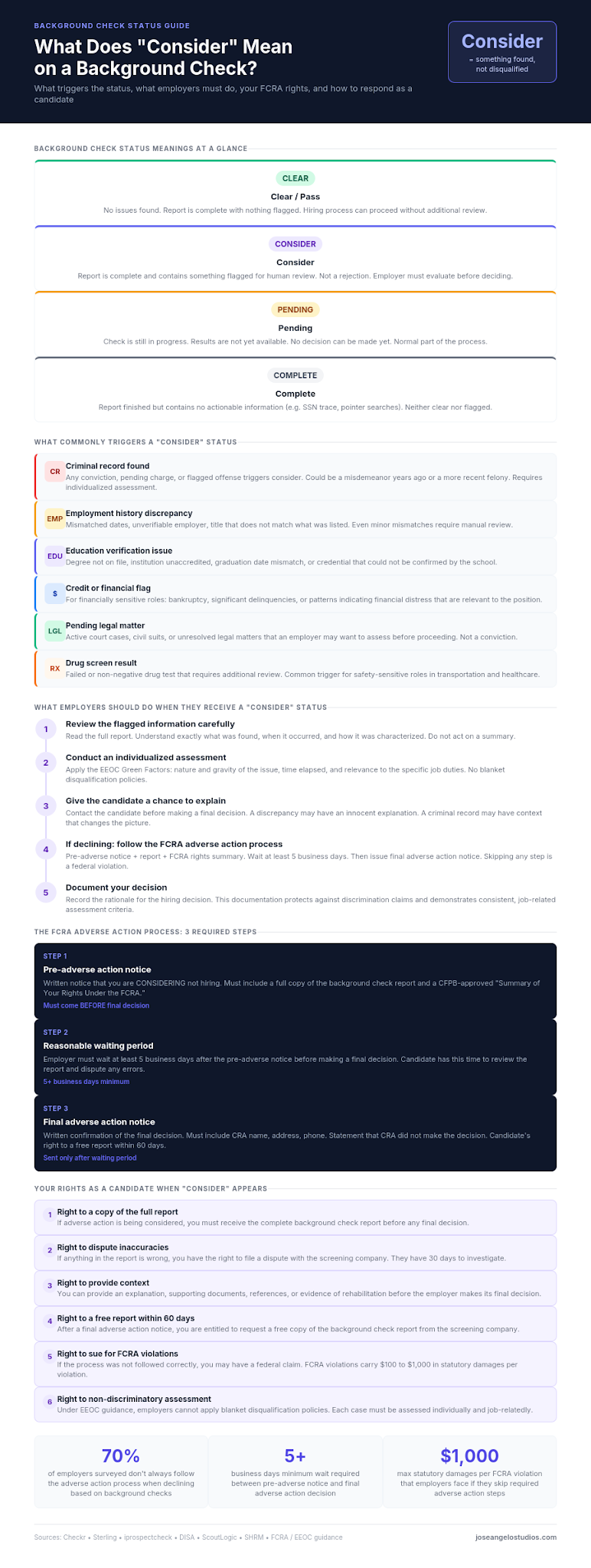 Quick answer: "Consider" means the background check is complete and contains information that an employer needs to evaluate before making a hiring decision. It is not a rejection. The screening company does not make the hiring decision. The employer does. And the law requires employers to follow a strict process before they can decline you based on what they found.